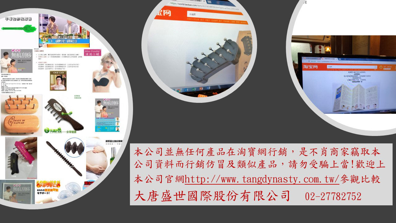 本公司並無任何產品在淘寶網行銷,以上產品是不肖商家 竊取本公司資料而行銷仿冒及類似產品,請勿受騙上當! 歡迎上本公司官網http://www.tangdynasty.com.tw/ 參觀比較 大唐盛世國際股份有限公司 02-27782752
